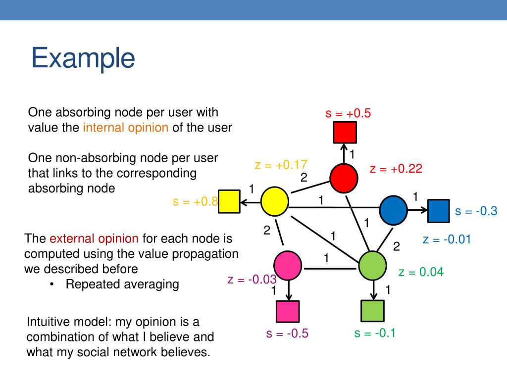 Example One absorbing node per user with value the internal opinion of the user One non-absorbing node per user that links to the corresponding absorbing node s = +0.5 1 z = +0.17 z = +0.22 1 1 2 s = +0.8 s = -0.3 1 • The external opinion for each node is computed using the value propagation we described before • Repeated averaging z = -0.01 1 2 1 2 z = 0.04 1 z = -0.03 1 1 Intuitive model: my opinion is a combination of what I believe and what my social network believes. s = -0.1 s = -0.5