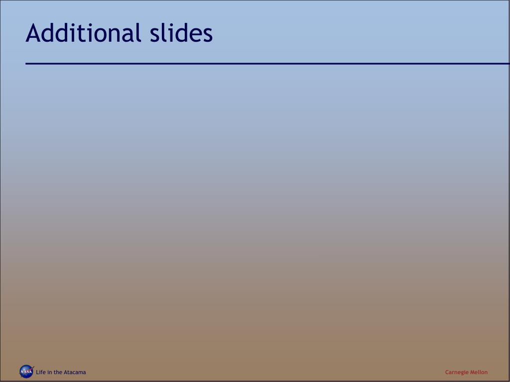 Summary • Insolation • Observed 900 W/m2 peaks (mid day) • Observed decrease in peak insolation over time • Total daily energy averaged 21 x 106 J/m2/day • Cell characterization • Efficiency: ATJ 26.6%, Si undetermined • Performing additional testing • Spectrophotometery • Spectral distribution shift observed over day • Calibration and drift issues to be addressed Carnegie Mellon