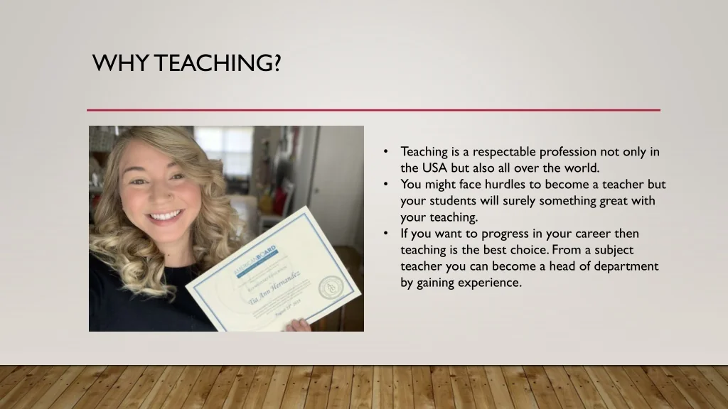 Why Teaching? • Teaching is a respectable profession not only in the USA but also all over the world. • You might face hurdles to become a teacher but your students will surely something great with your teaching. • If you want to progress in your career then teaching is the best choice. From a subject teacher you can become a head of department by gaining experience.
