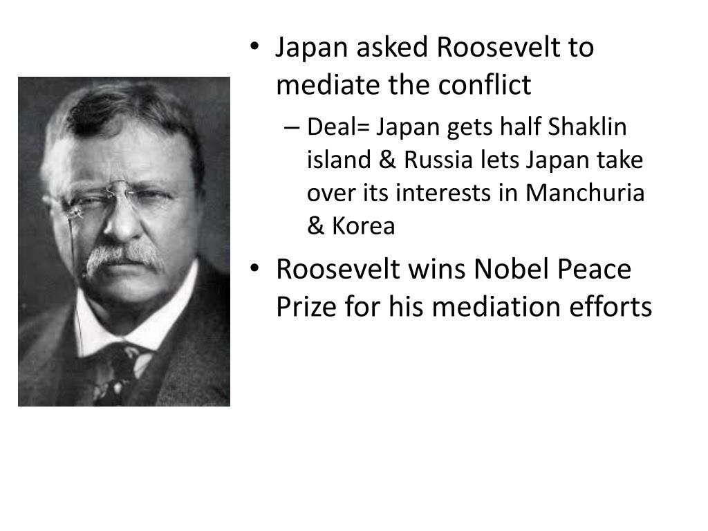 Japan asked Roosevelt to mediate the conflict • Deal= Japan gets half Shaklin island & Russia lets Japan take over its interests in Manchuria & Korea • Roosevelt wins Nobel Peace Prize for his mediation efforts