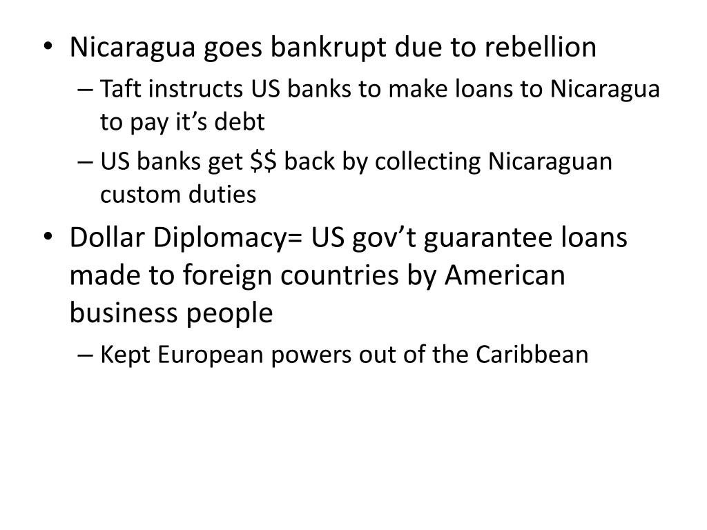 Nicaragua goes bankrupt due to rebellion • Taft instructs US banks to make loans to Nicaragua to pay it’s debt • US banks get $$ back by collecting Nicaraguan custom duties • Dollar Diplomacy= US gov’t guarantee loans made to foreign countries by American business people • Kept European powers out of the Caribbean