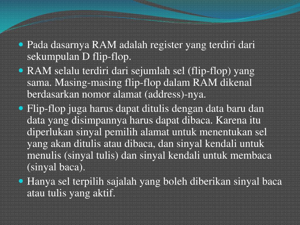 Padadasarnya RAM adalah register yang terdiridarisekumpulan D flip-flop. • RAM selaluterdiridarisejumlahsel (flip-flop) yang sama. Masing-masing flip-flop dalam RAM dikenalberdasarkannomoralamat (address)-nya. • Flip-flop jugaharusdapatditulisdengan data barudan data yang disimpannyaharusdapatdibaca. Karenaitudiperlukansinyalpemilihalamatuntukmenentukansel yang akanditulisataudibaca, dansinyalkendaliuntukmenulis (sinyaltulis) dan sinyalkendaliuntukmembaca (sinyal baca). • Hanyaselterpilihsajalah yang bolehdiberikansinyalbacaatautulis yang aktif.