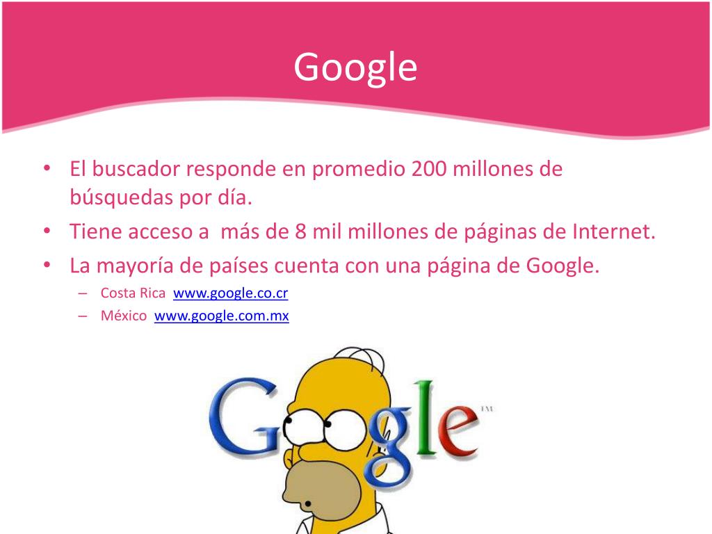 Google • El buscadorresponde en promedio 200 millones de búsquedaspordía. • Tieneacceso a más de 8 mil millones de páginas de Internet. • La mayoría de paísescuenta con unapágina de Google. • Costa Rica www.google.co.cr • Méxicowww.google.com.mx