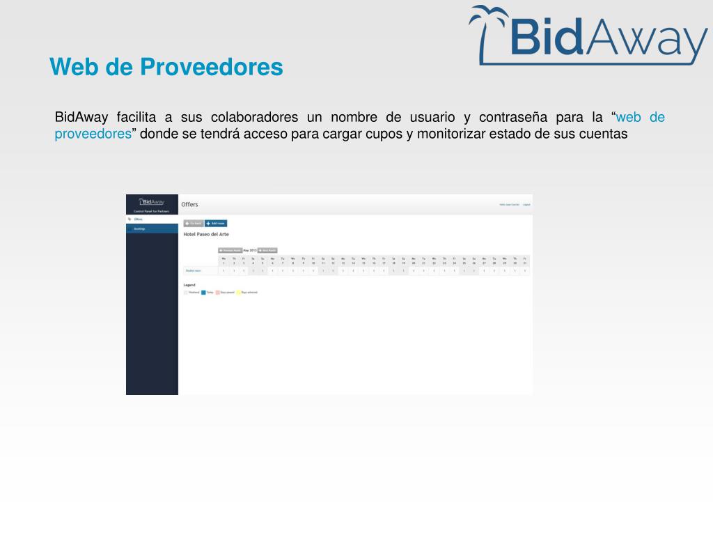 Web de Proveedores BidAway facilita a sus colaboradores un nombre de usuario y contraseña para la “web de proveedores” donde se tendrá acceso para cargar cupos y monitorizar estado de sus cuentas