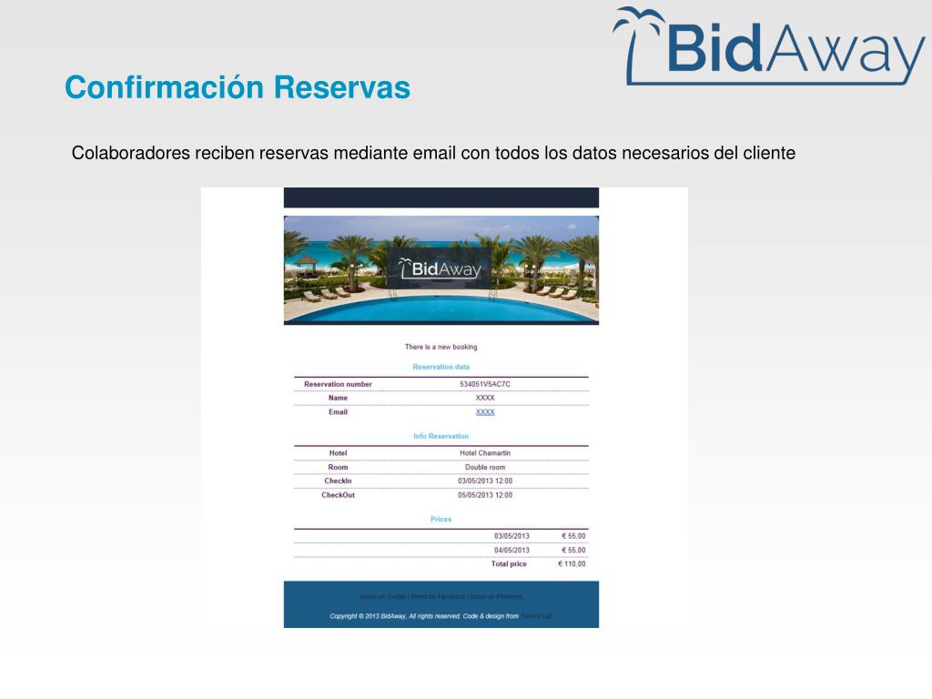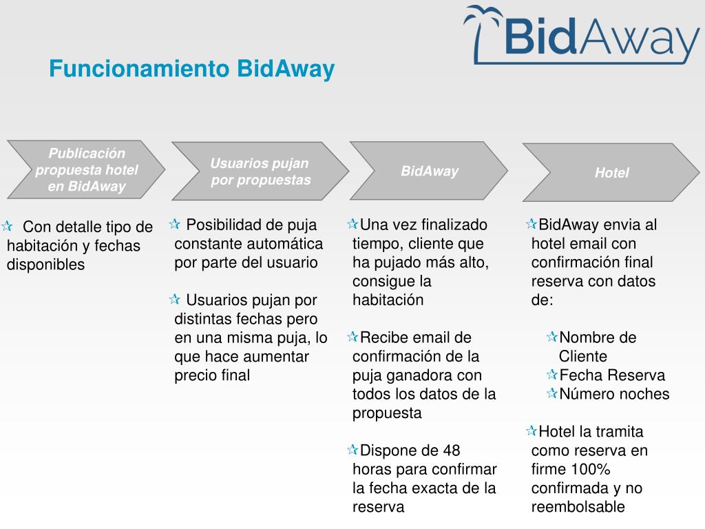 Potencial de la colaboración En BidAway somos partners de los colaboradores y les ayudamos a maximizar la rentabilidad de las habitaciones que en ningún caso habrían sido vendidas, sin dañar la imagen corporativa. Promoción Canales Offline Portales Descuentos Hotel Inversiónelevada Descuentos elevados CAMPAÑA on-line • Inversión nula • Rentabilidad inmediata • Marca intacta • Impacto cuantificable e identificable • No spam a clientes • Fácil controlar • Complemento al revenue management BidAway Impactoelevado Difícil rentabilizar Impactoelevado Difícilcuantificar eidentificar Captación clientes desconocida Clientes nuevos sin identificar Desvirtuación marca e imagen comercial Continuos spam a clientes