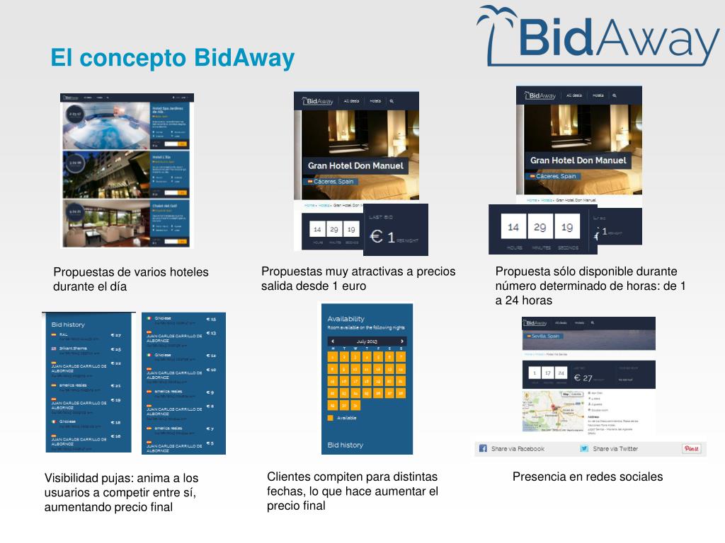El concepto BidAway • Presencia en redes sociales Propuestas muy atractivas a precios salida desde 1 euro Propuesta sólo disponible durante número determinado de horas: de 1 a 24 horas Propuestas de varios hoteles durante el día Clientes compiten para distintas fechas, lo que hace aumentar el precio final Visibilidad pujas: anima a los usuarios a competir entre sí, aumentando precio final
