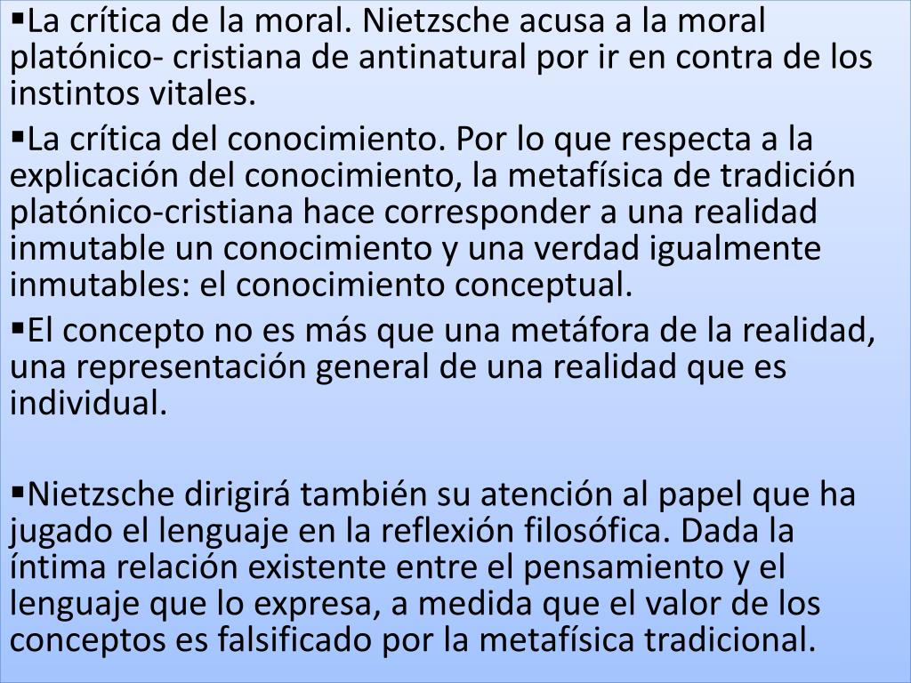 La crítica de la moral. Nietzsche acusa a la moral platónico- cristiana de antinatural por ir en contra de los instintos vitales. La crítica del conocimiento. Por lo que respecta a la explicación del conocimiento, la metafísica de tradición platónico-cristiana hace corresponder a una realidad inmutable un conocimiento y una verdad igualmente inmutables: el conocimiento conceptual. El concepto no es más que una metáfora de la realidad, una representación general de una realidad que es individual. Nietzsche dirigirá también su atención al papel que ha jugado el lenguaje en la reflexión filosófica. Dada la íntima relación existente entre el pensamiento y el lenguaje que lo expresa, a medida que el valor de los conceptos es falsificado por la metafísica tradicional.