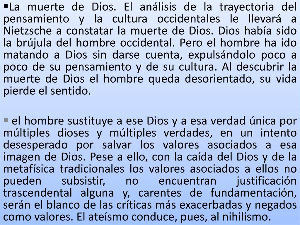 La muerte de Dios.El análisis de la trayectoria del pensamiento y la cultura occidentales le llevará a Nietzsche a constatar la muerte de Dios. Dios había sido la brújula del hombre occidental. Pero el hombre ha ido matando a Dios sin darse cuenta, expulsándolo poco a poco de su pensamiento y de su cultura. Al descubrir la muerte de Dios el hombre queda desorientado, su vida pierde el sentido. el hombre sustituye a ese Dios y a esa verdad única por múltiples dioses y múltiples verdades, en un intento desesperado por salvar los valores asociados a esa imagen de Dios. Pese a ello, con la caída del Dios y de la metafísica tradicionales los valores asociados a ellos no pueden subsistir, no encuentran justificación trascendental alguna y, carentes de fundamentación, serán el blanco de las críticas más exacerbadas y negados como valores. El ateísmo conduce, pues, al nihilismo.