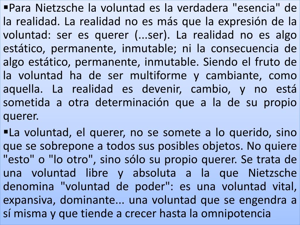 La nueva Filosofía Para Nietzsche la voluntad es la verdadera "esencia" de la realidad. La realidad no es más que la expresión de la voluntad: ser es querer (...ser). La realidad no es algo estático, permanente, inmutable; ni la consecuencia de algo estático, permanente, inmutable. Siendo el fruto de la voluntad ha de ser multiforme y cambiante, como aquella. La realidad es devenir, cambio, y no está sometida a otra determinación que a la de su propio querer.