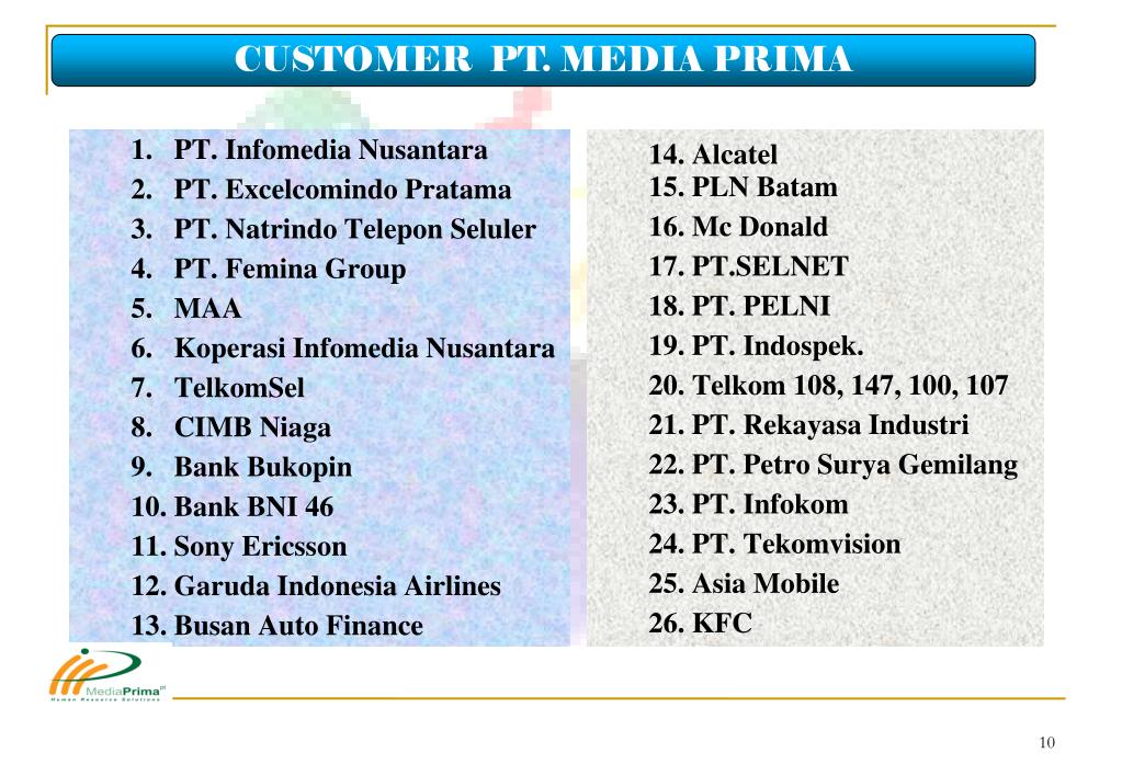 PT. Infomedia Nusantara PT. Excelcomindo Pratama PT. Natrindo Telepon Seluler PT. Femina Group MAA Koperasi Infomedia Nusantara TelkomSel CIMB Niaga Bank Bukopin Bank BNI 46 Sony Ericsson 12. Garuda Indonesia Airlines 13. Busan Auto Finance 14. Alcatel 15. PLN Batam 16. Mc Donald 17. PT.SELNET 18. PT. PELNI 19. PT. Indospek. 20. Telkom 108, 147, 100, 107 21. PT. Rekayasa Industri 22. PT. Petro Surya Gemilang 23. PT. Infokom 24. PT. Tekomvision 25. Asia Mobile 26. KFC CUSTOMER PT. MEDIA PRIMA