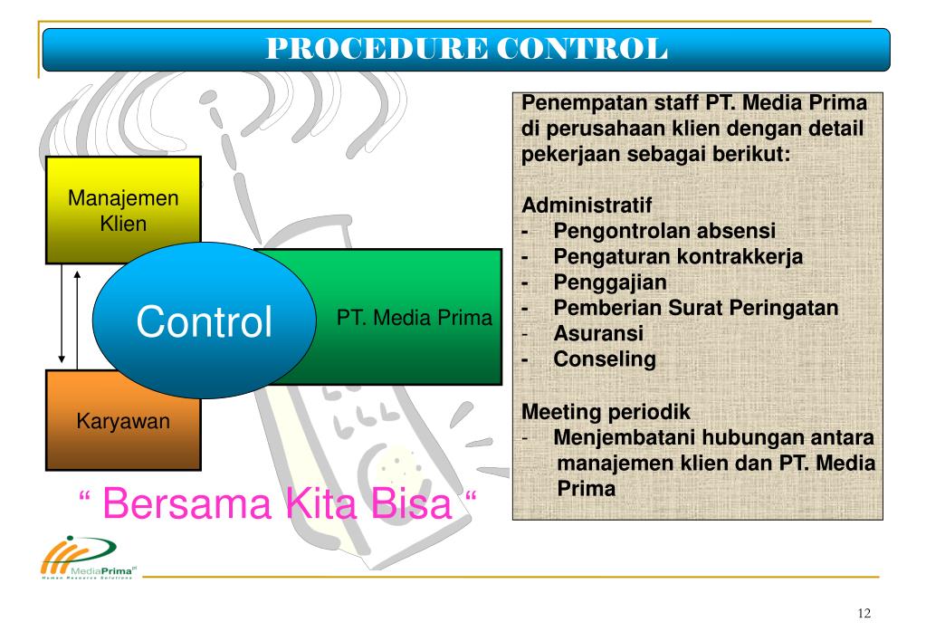 PROCEDURE CONTROL • Penempatan staff PT. Media Prima • di perusahaan klien dengan detail • pekerjaan sebagai berikut: • Administratif • - Pengontrolan absensi - Pengaturan kontrakkerja - Penggajian - Pemberian Surat Peringatan • Asuransi - Conseling Meeting periodik • Menjembatani hubungan antara manajemen klien dan PT. Media Prima Manajemen Klien Control PT. Media Prima Karyawan “ Bersama Kita Bisa “