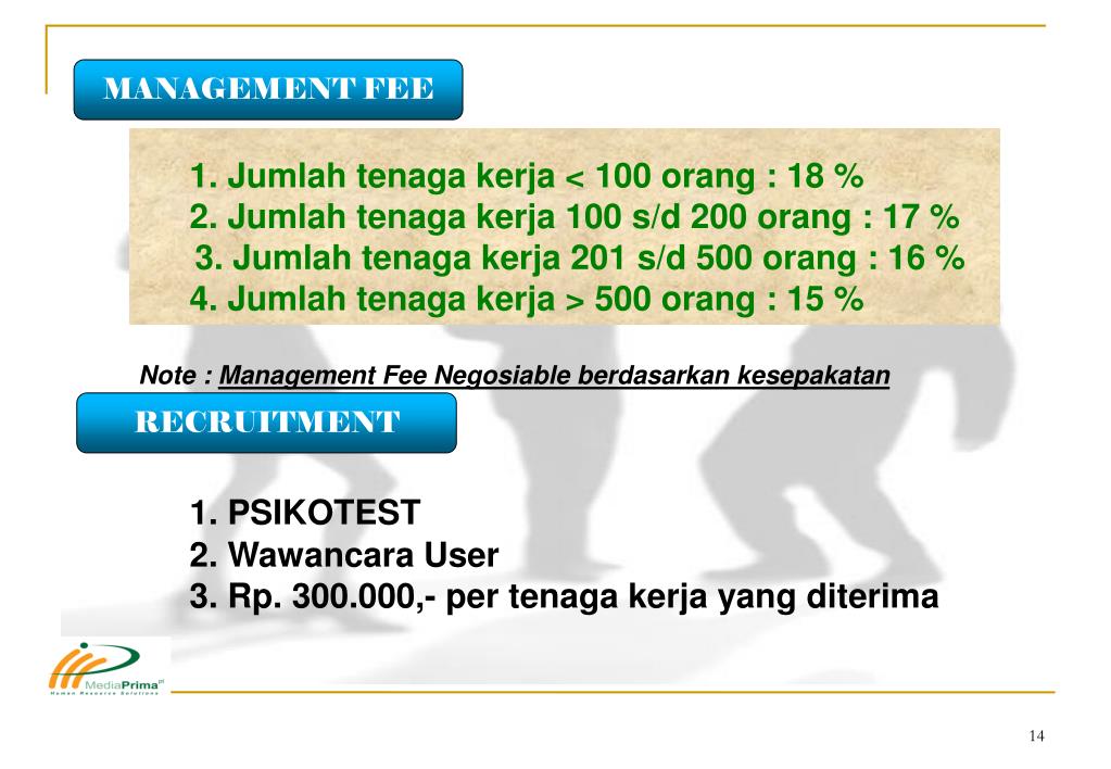 MANAGEMENT FEE 1. Jumlah tenaga kerja < 100 orang : 18 % 2. Jumlah tenaga kerja 100 s/d 200 orang : 17 % 3. Jumlah tenaga kerja 201 s/d 500 orang : 16 % 4. Jumlah tenaga kerja > 500 orang : 15 %Note : Management Fee Negosiable berdasarkan kesepakatan bersama1. PSIKOTEST 2. Wawancara User 3. Rp. 300.000,- per tenaga kerja yang diterima RECRUITMENT