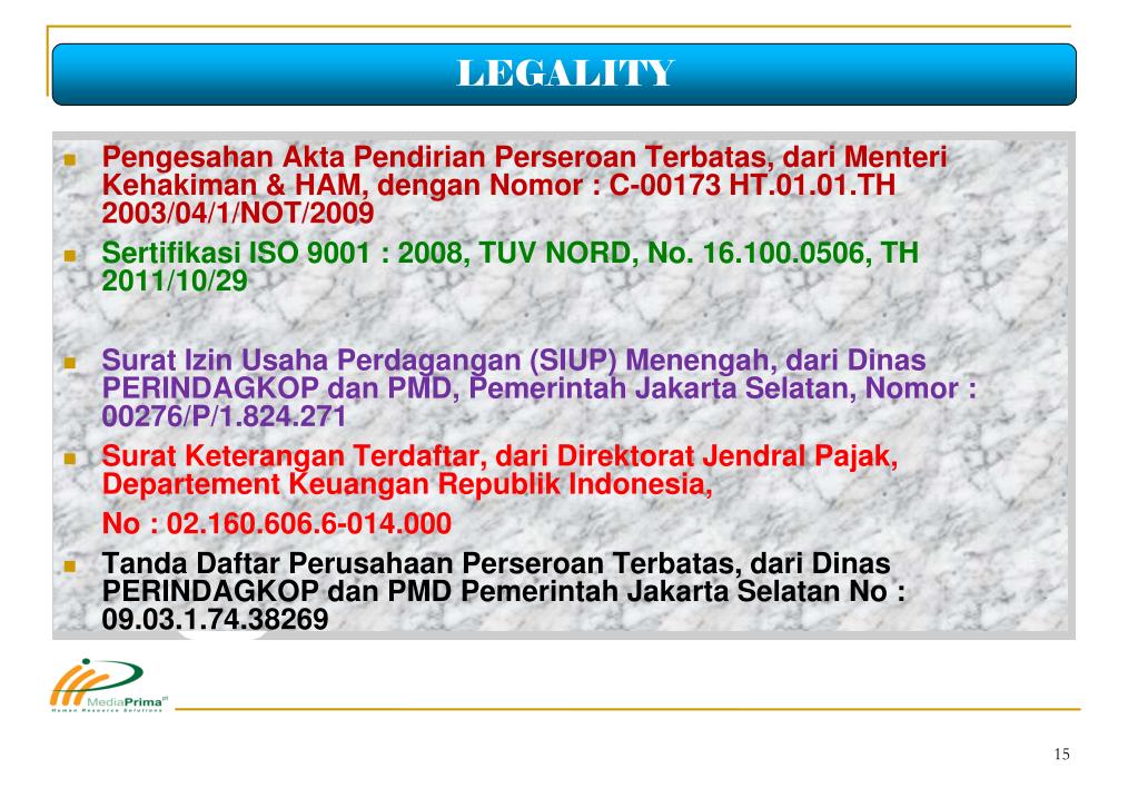 LEGALITY • Pengesahan Akta Pendirian Perseroan Terbatas, dari Menteri Kehakiman & HAM, dengan Nomor : C-00173 HT.01.01.TH 2003/04/1/NOT/2009 • Sertifikasi ISO 9001 : 2008, TUV NORD, No. 16.100.0506, TH 2011/10/29 • Surat Izin Usaha Perdagangan (SIUP) Menengah, dari Dinas PERINDAGKOP dan PMD, Pemerintah Jakarta Selatan, Nomor : 00276/P/1.824.271 • Surat Keterangan Terdaftar, dari Direktorat Jendral Pajak, Departement Keuangan Republik Indonesia, No : 02.160.606.6-014.000 • Tanda Daftar Perusahaan Perseroan Terbatas, dari Dinas PERINDAGKOP dan PMD Pemerintah Jakarta Selatan No : 09.03.1.74.38269
