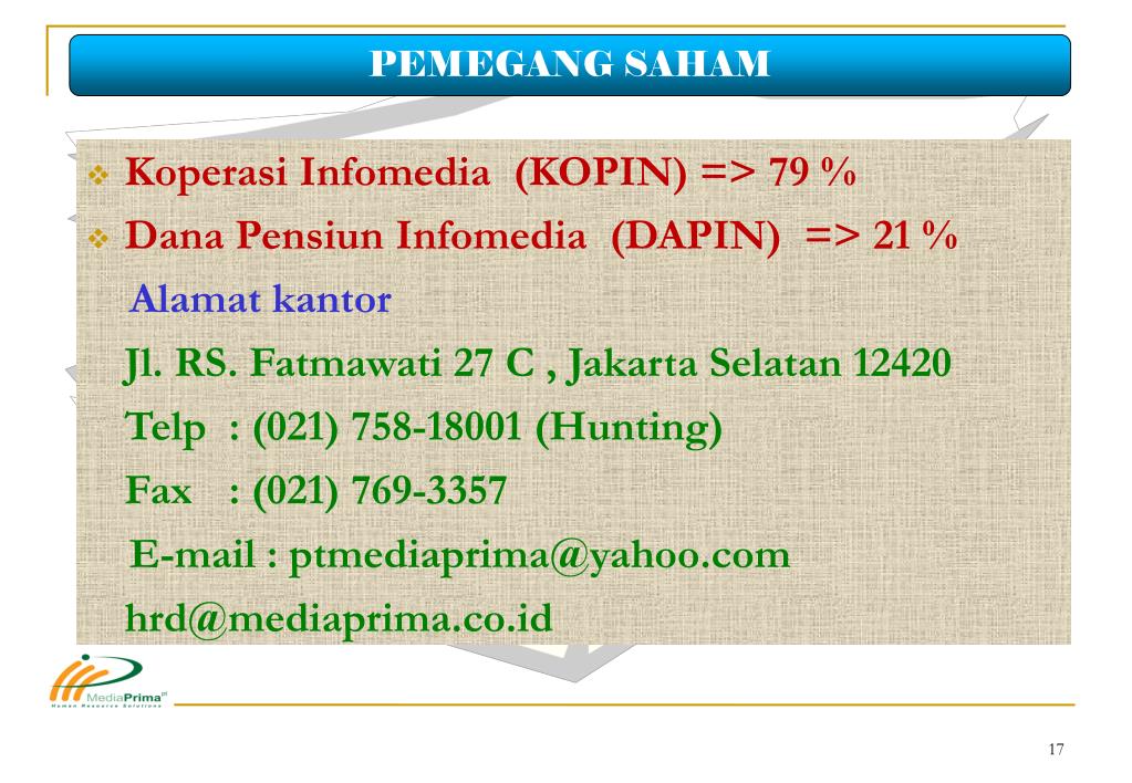 PEMEGANG SAHAM • Koperasi Infomedia (KOPIN) => 79 % • Dana Pensiun Infomedia (DAPIN) => 21 % Alamat kantor Jl. RS. Fatmawati 27 C , Jakarta Selatan 12420 Telp : (021) 758-18001 (Hunting) Fax : (021) 769-3357 E-mail : ptmediaprima@yahoo.com hrd@mediaprima.co.id