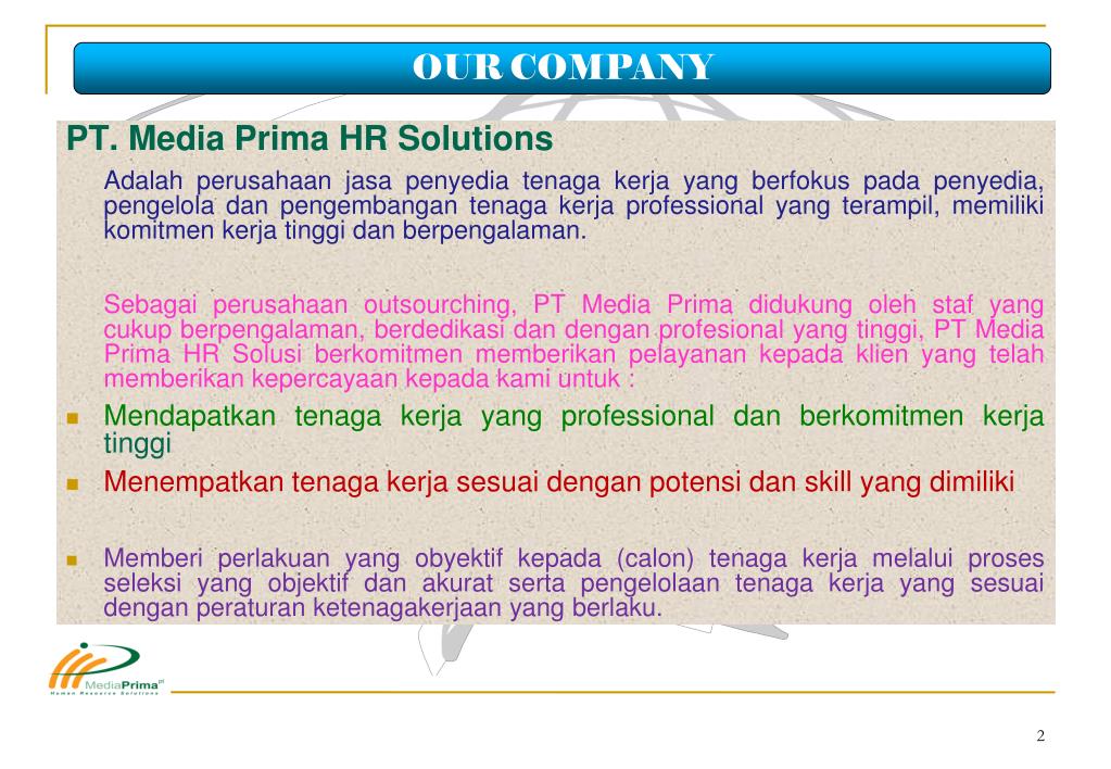 OUR COMPANY. PT. Media Prima HR Sol utions Adalah perusahaan jasa penyedia tenaga kerja yang berfokus pada penyedia , pengelola dan pengembangan tenaga kerja professional yang terampil , memiliki komitmen kerja tinggi dan berpengalaman .