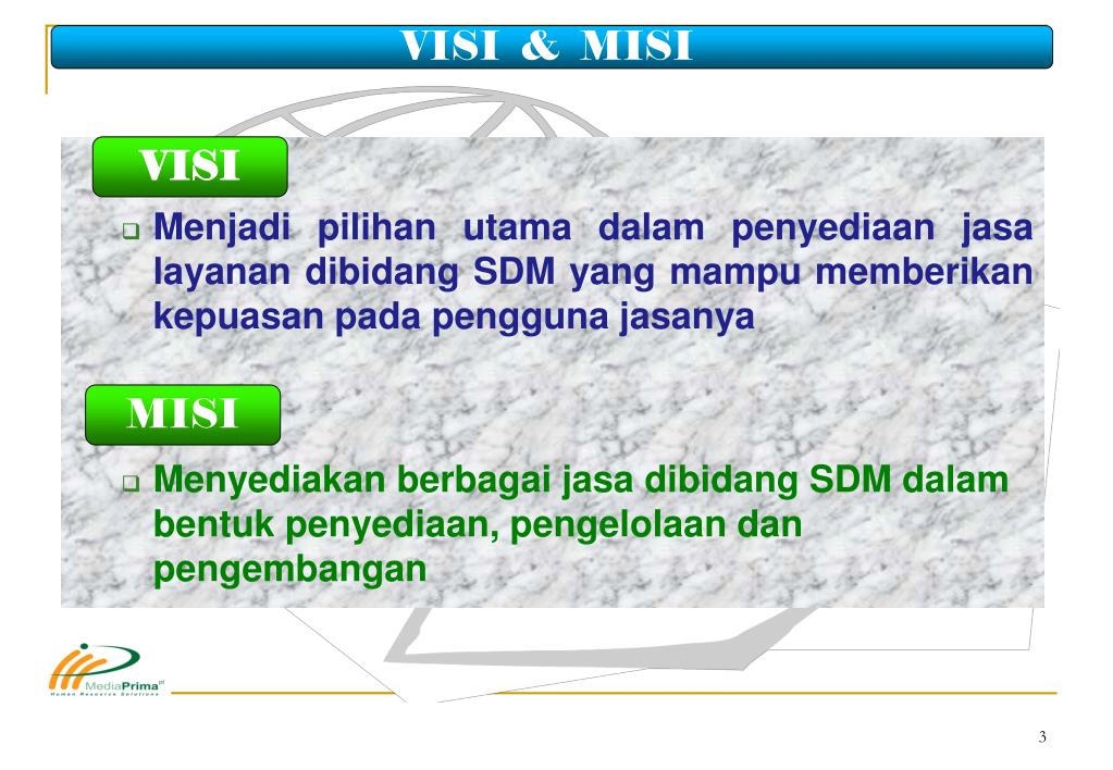 VISI & MISI • Menjadipilihanutamadalampenyediaanjasalayanandibidang SDM yang mampumemberikankepuasanpadapenggunajasanya • Menyediakanberbagaijasadibidang SDM dalambentukpenyediaan, pengelolaandanpengembangan VISI MISI