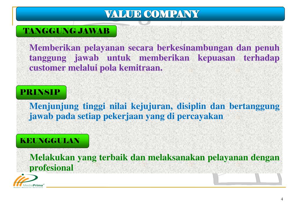 VALUE COMPANY TANGGUNG JAWAB Memberikan pelayanan secara berkesinambungan dan penuh tanggung jawab untuk memberikan kepuasan terhadap customer melalui pola kemitraan. Menjunjung tinggi nilai kejujuran, disiplin dan bertanggung jawab pada setiap pekerjaan yang di percayakan Melakukan yang terbaik dan melaksanakan pelayanan dengan profesional PRINSIP KEUNGGULAN