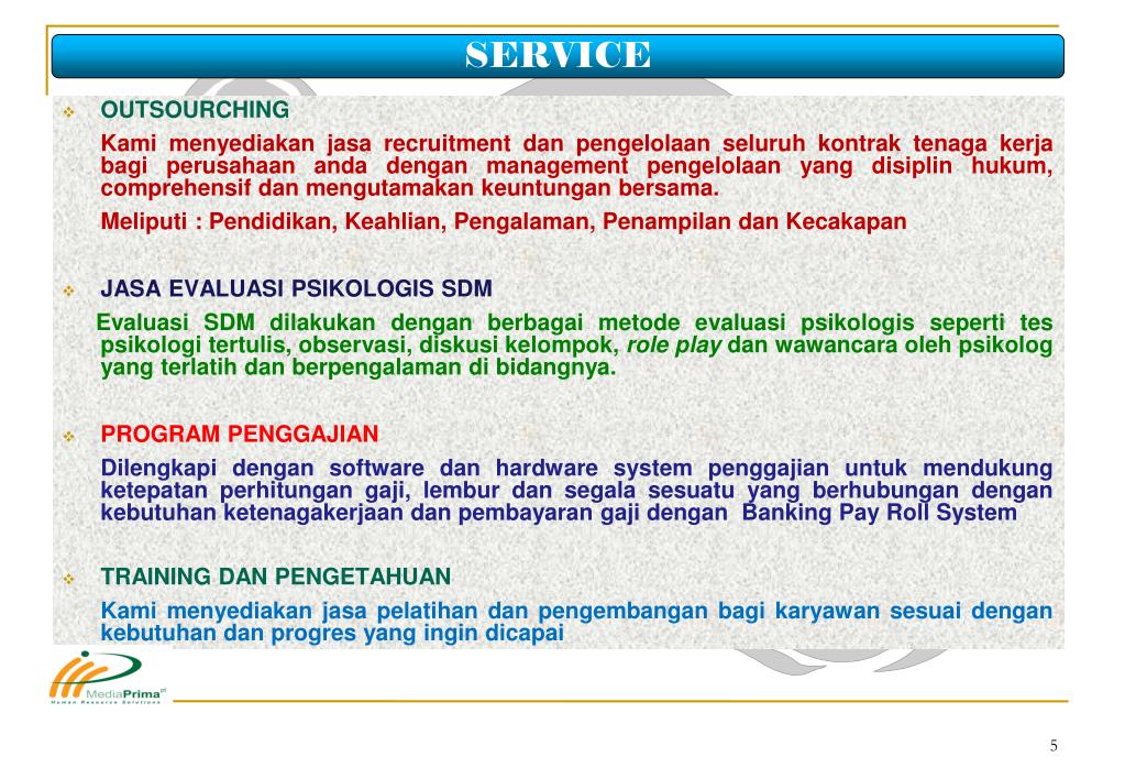 SERVICE • OUTSOURCHING Kami menyediakan jasa recruitment dan pengelolaan seluruh kontrak tenaga kerja bagi perusahaan anda dengan management pengelolaan yang disiplin hukum, comprehensif dan mengutamakan keuntungan bersama. Meliputi : Pendidikan, Keahlian, Pengalaman, Penampilan dan Kecakapan • JASA EVALUASI PSIKOLOGIS SDM Evaluasi SDM dilakukan dengan berbagai metode evaluasi psikologis seperti tes psikologi tertulis, observasi, diskusi kelompok, role play dan wawancara oleh psikolog yang terlatih dan berpengalaman di bidangnya. • PROGRAM PENGGAJIAN Dilengkapi dengan software dan hardware system penggajian untuk mendukung ketepatan perhitungan gaji, lembur dan segala sesuatu yang berhubungan dengan kebutuhan ketenagakerjaan danpembayarangajidengan Banking Pay Roll System • TRAINING DAN PENGETAHUAN Kami menyediakan jasa pelatihan dan pengembangan bagi karyawan sesuai dengan kebutuhan dan progres yang ingin dicapai