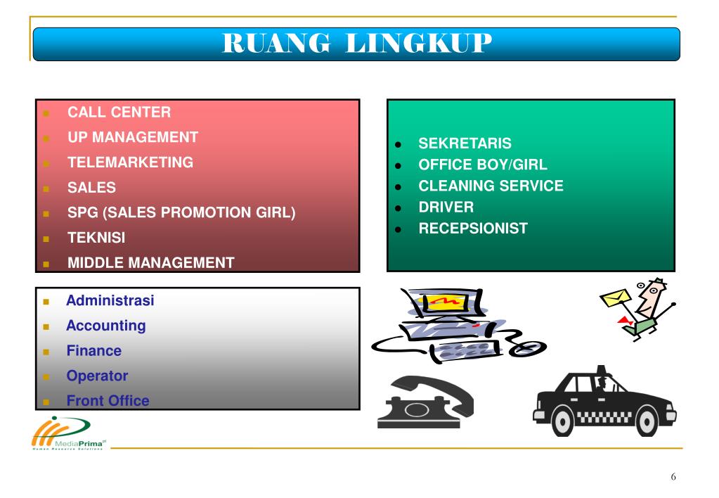 RUANG LINGKUP • SEKRETARIS • OFFICE BOY/GIRL • CLEANING SERVICE • DRIVER • RECEPSIONIST • CALL CENTER • UP MANAGEMENT • TELEMARKETING • SALES • SPG (SALES PROMOTION GIRL) • TEKNISI • MIDDLE MANAGEMENT • Administrasi • Accounting • Finance • Operator • Front Office