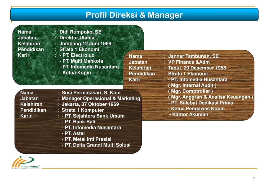 Profil Direksi & Manager Nama : DidiRumpoko, SE Jabatan : DirekturUtama Kelahiran : Jombang,12 Juni 1966 Pendidikan : Strata 1 Ekonomi Karir : - PT. Electrolux - PT. Multi Mahkota - PT. Infomedia Nusantara - KetuaKopin Nama : Janner Tambunan, SE Jabatan : VP Finance &Adm Kelahiran : Taput, 20 Desember 1958 Pendidikan : Strata 1 Ekonomi Karir : - PT. Infomedia Nusantara ( Mgr. Internal Audit ) ( Mgr. Comptroller ) ( Mgr. Anggran & Analisa Keuangan ) - PT. Balebat Dedikasi Prima - Ketua Pengawas Kopin - Kantor Akuntan Nama : Susi Permatasari, S. Kom Jabatan : Manager Operasional & Marketing Kelahiran : Jakarta, 07 Oktober 1969 Pendidikan : Strata 1 Komputer Karir : - PT. Sejahtera Bank Umum - PT. Bank Bali - PT. Infomedia Nusantara - PT. Astel - PT. Metal IntiPresisi - PT. Delta Grandi Multi Solusi