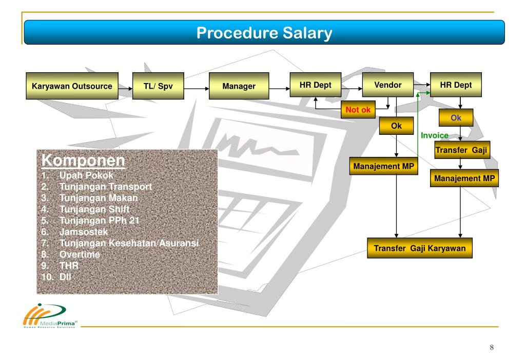 Procedure Salary Karyawan Outsource TL/ Spv Manager HR Dept Vendor HR Dept Not ok Ok Ok Invoice Transfer Gaji Komponen • Upah Pokok • Tunjangan Transport • Tunjangan Makan • Tunjangan Shift • Tunjangan PPh 21 • Jamsostek • Tunjangan Kesehatan/Asuransi • Overtime • THR • Dll Manajement MP Manajement MP Transfer Gaji Karyawan
