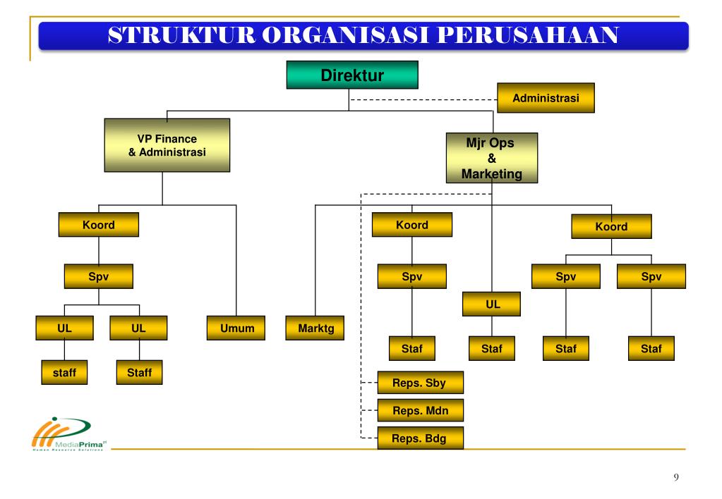 STRUKTUR ORGANISASI PERUSAHAAN Direktur Administrasi VP Finance & Administrasi Mjr Ops & Marketing Koord Koord Koord Spv Spv Spv Spv UL UL UL Umum Marktg Staf Staf Staf Staf staff Staff Reps. Sby Reps. Mdn Reps. Bdg