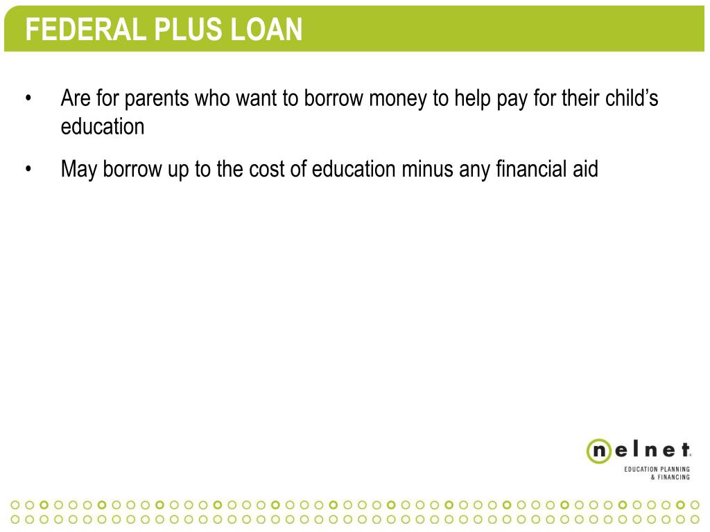FEDERAL PLUS LOAN • Are for parents who want to borrow money to help pay for their child’s education • May borrow up to the cost of education minus any financial aid