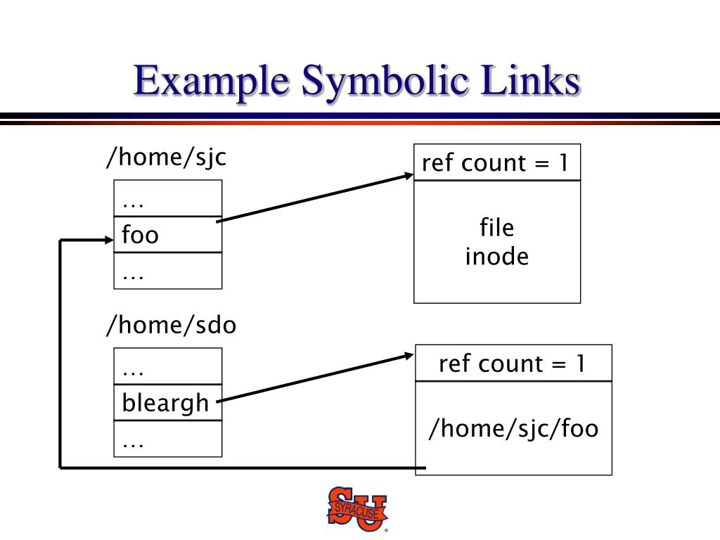 Example Symbolic Links /home/sjc ref count = 1 … file inode foo … /home/sdo ref count = 1 … /home/sjc/foo bleargh …