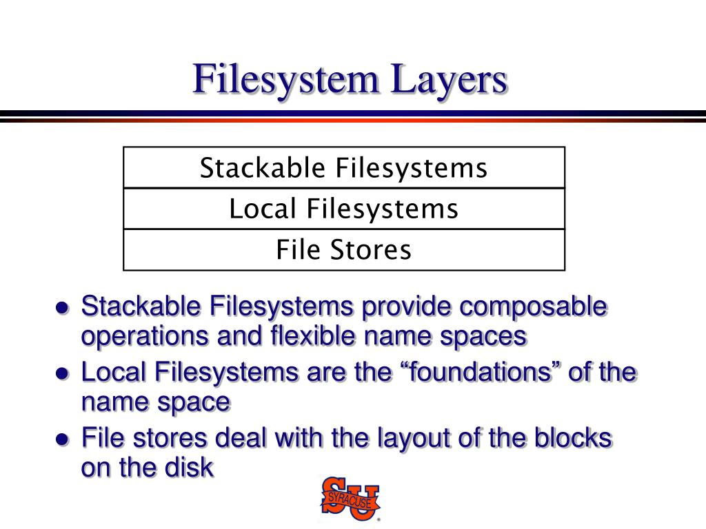 Filesystem Layers Stackable Filesystems Local Filesystems File Stores • Stackable Filesystems provide composable operations and flexible name spaces • Local Filesystems are the “foundations” of the name space • File stores deal with the layout of the blocks on the disk