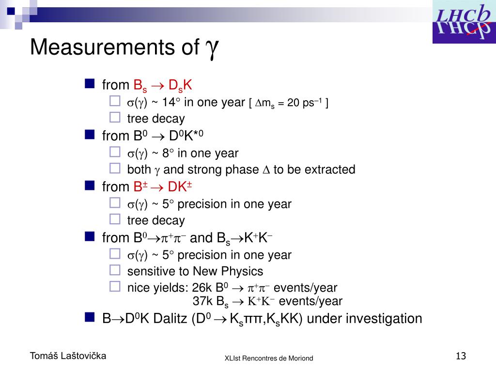 Measurements of γ • from Bs DsK • s(g) ~ 14 in one year [ ms = 20 ps–1 ] • tree decay • from B0 D0K*0 • () ~ 8 in one year • both g and strong phase D to be extracted • from B± DK± • () ~ 5 precision in one year • tree decay • from B and BsKK • () ~ 5 precision in one year • sensitive to New Physics • nice yields: 26k B0 p+p-events/year 37k Bs K+K- events/year • BD0K Dalitz (D0 Ksππ,KsKK) under investigation Tomáš Laštovička