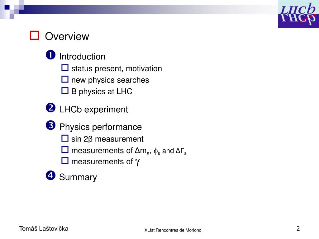 Overview • Introduction • status present, motivation • new physics searches • B physics at LHC • LHCb experiment • Physics performance • sin 2β measurement • measurements of Δms, s and ΔΓs • measurements of γ • Summary Tomáš Laštovička