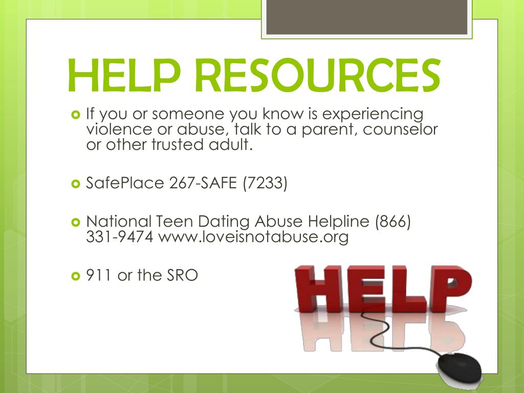 HELP RESOURCES • If you or someone you know is experiencing violence or abuse, talk to a parent, counselor or other trusted adult. • SafePlace 267-SAFE (7233) • National Teen Dating Abuse Helpline (866) 331-9474 www.loveisnotabuse.org • 911 or the SRO