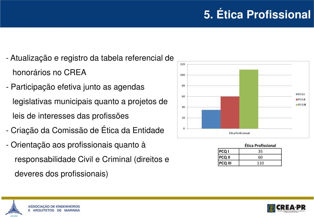 5. Ética Profissional - Atualização e registro da tabela referencial de honorários no CREA- Participação efetiva junto as agendas legislativas municipais quanto a projetos de leis de interesses das profissões- Criação da Comissão de Ética da Entidade- Orientação aos profissionais quanto à responsabilidade Civil e Criminal (direitos e deveres dos profissionais)
