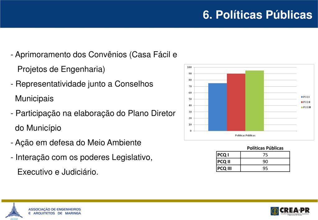 6. Políticas Públicas • Aprimoramento dos Convênios (Casa Fácil e • Projetos de Engenharia) • Representatividade junto a Conselhos • Municipais • Participação na elaboração do Plano Diretor • do Município • Ação em defesa do Meio Ambiente • Interação com os poderes Legislativo, • Executivo e Judiciário.