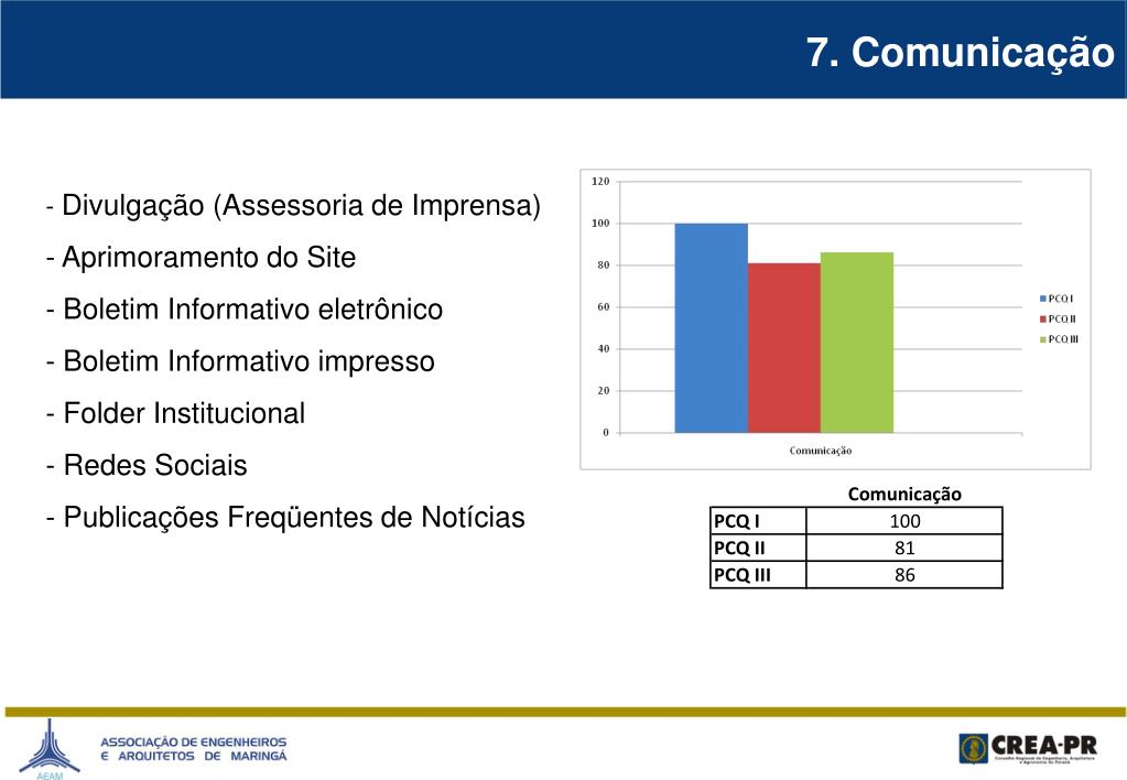 7. Comunicação • - Divulgação (Assessoria de Imprensa) • Aprimoramento do Site • Boletim Informativo eletrônico • Boletim Informativo impresso • Folder Institucional • Redes Sociais • - Publicações Freqüentes de Notícias