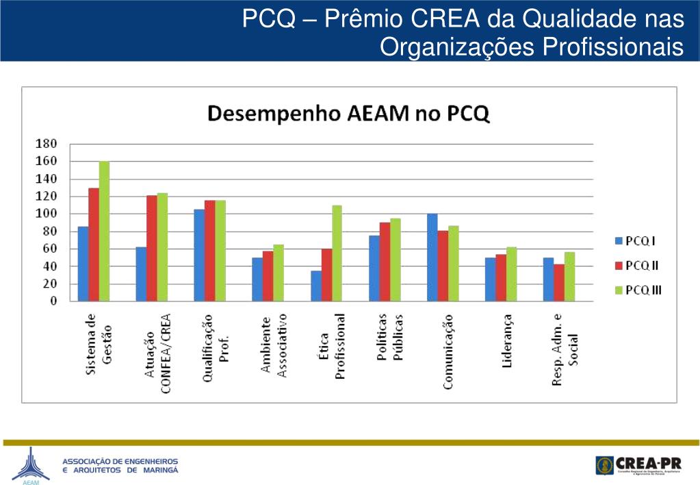 PCQ – Prêmio CREA da Qualidade nas Organizações Profissionais • A AEAM no PCQ: • I Ciclo 2007/2008 – 1º Lugar • Destaque: Comunicação • II Ciclo 2009 – 1º Lugar • Destaque: Qualificação Profissional, Comunicação, Políticas Públicas • III Ciclo 2010 – 2º Lugar • Destaque: Ética Profissional • IV Ciclo 2011 – Auditoria prevista para outubro