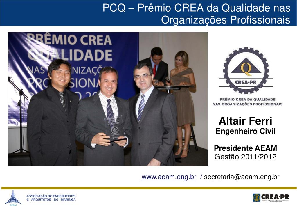PCQ – Prêmio CREA da Qualidade nas Organizações Profissionais Altair Ferri Engenheiro Civil Presidente AEAM Gestão 2011/2012 www.aeam.eng.br / secretaria@aeam.eng.br