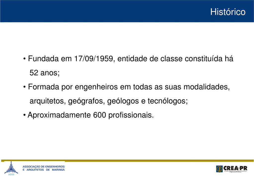 Histórico. Fundada em 17/09/1959, entidade de classe constituída há 52 anos; Formada por engenheiros em todas as suas modalidades, arquitetos, geógrafos, geólogos e tecnólogos; Aproximadamente 600 profissionais. Missão AEAM.