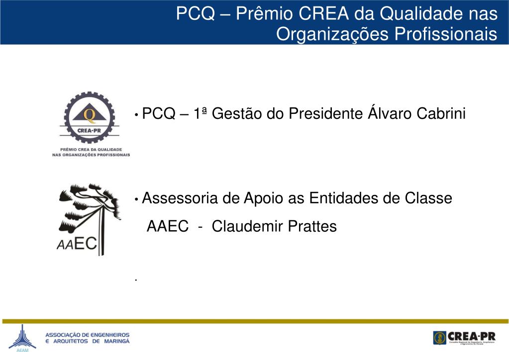PCQ – Prêmio CREA da Qualidade nas Organizações Profissionais • PCQ – 1ª Gestão do Presidente Álvaro Cabrini • Assessoria de Apoio as Entidades de Classe • AAEC - Claudemir Prattes • .