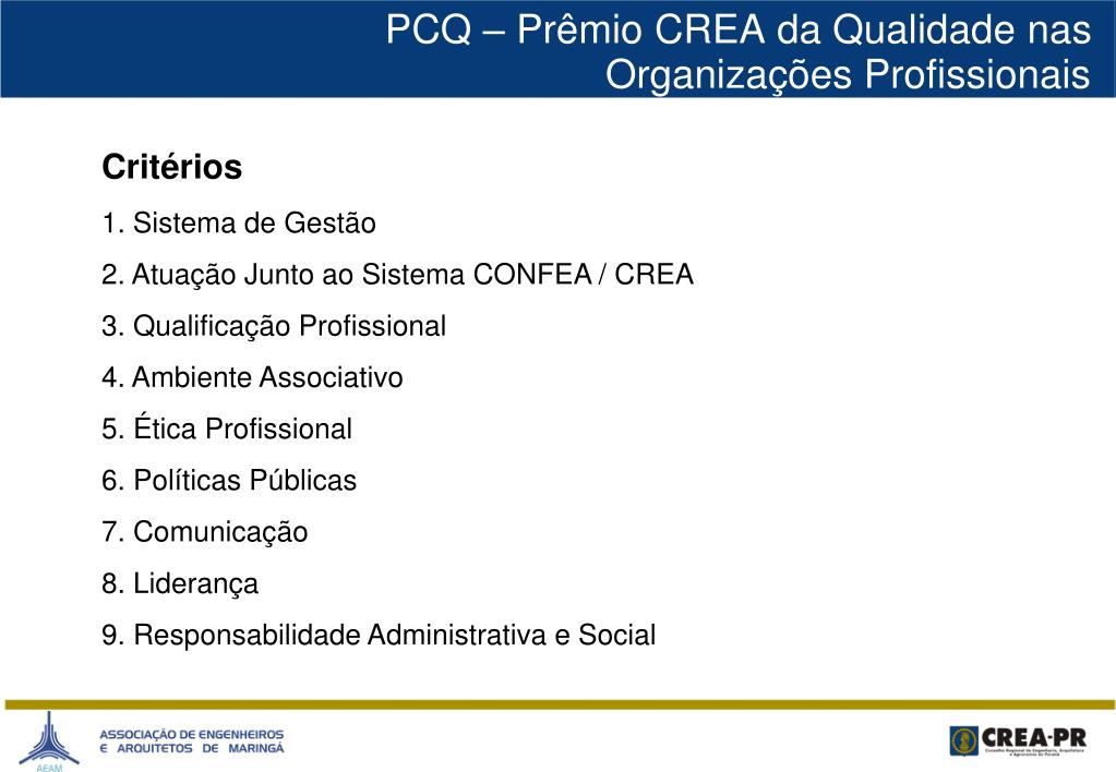 PCQ – Prêmio CREA da Qualidade nas Organizações Profissionais Critérios 1. Sistema de Gestão 2. Atuação Junto ao Sistema CONFEA / CREA 3. Qualificação Profissional 4. Ambiente Associativo 5. Ética Profissional 6. Políticas Públicas 7. Comunicação 8. Liderança 9. Responsabilidade Administrativa e Social