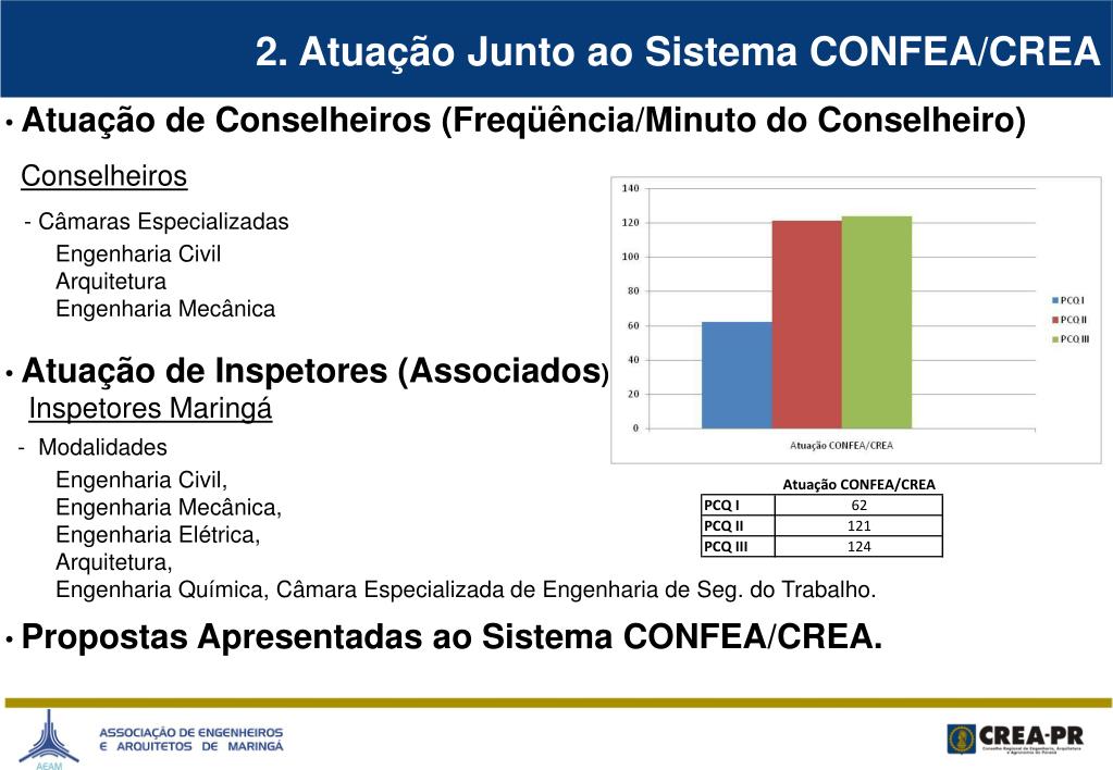 2. Atuação Junto ao Sistema CONFEA/CREA • Atuação de Conselheiros (Freqüência/Minuto do Conselheiro) • Conselheiros • - Câmaras Especializadas • Engenharia Civil • Arquitetura • Engenharia Mecânica • Atuação de Inspetores (Associados) • Inspetores Maringá • - Modalidades • Engenharia Civil, • Engenharia Mecânica, • Engenharia Elétrica, • Arquitetura, • Engenharia Química, Câmara Especializada de Engenharia de Seg. do Trabalho. • Propostas Apresentadas ao Sistema CONFEA/CREA.