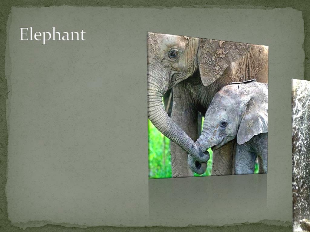 Elephants are Really, Really Smart • Diet: Elephants are herbivores and like to eat grass, and plants. They need to eat 300 to 600 pounds of food a day. • Type of Animal: Elephants are mammals • Natural Habitat: Africa and 11 Asian countries • There are three kinds of Elephants, African Bush, African Forest and Asian Elephants. I chose the elephant because they are really smart and are the larges land animal. In Asia they are