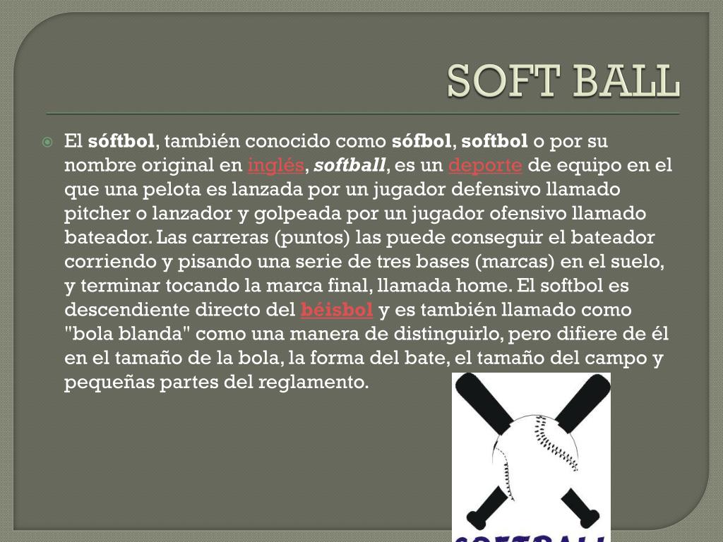 SOFT BALL El sóftbol, también conocido como sófbol, softbol o por su nombre original en inglés, softball, es un deporte de equipo en el que una pelota es lanzada por un jugador defensivo llamado pitcher o lanzador y golpeada por un jugador ofensivo llamado bateador. Las carreras (puntos) las puede conseguir el bateador corriendo y pisando una serie de tres bases (marcas) en el suelo, y terminar tocando la marca final, llamada home. El softbol es descendiente directo del béisbol y es también llamado como "bola blanda" como una manera de distinguirlo, pero difiere de él en el tamaño de la bola, la forma del bate, el tamaño del campo y pequeñas partes del reglamento.
