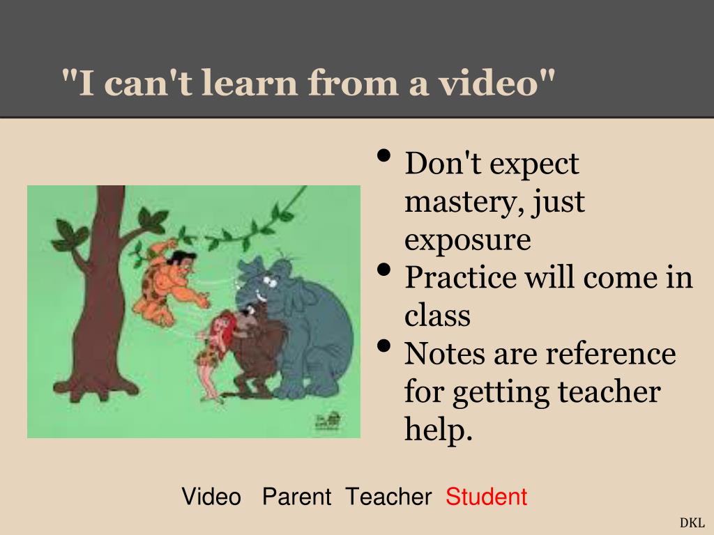 "I can't learn from a video" • Don't expect mastery, just exposure • Practice will come in class • Notes are reference for getting teacher help. Video Parent Teacher Student DKL