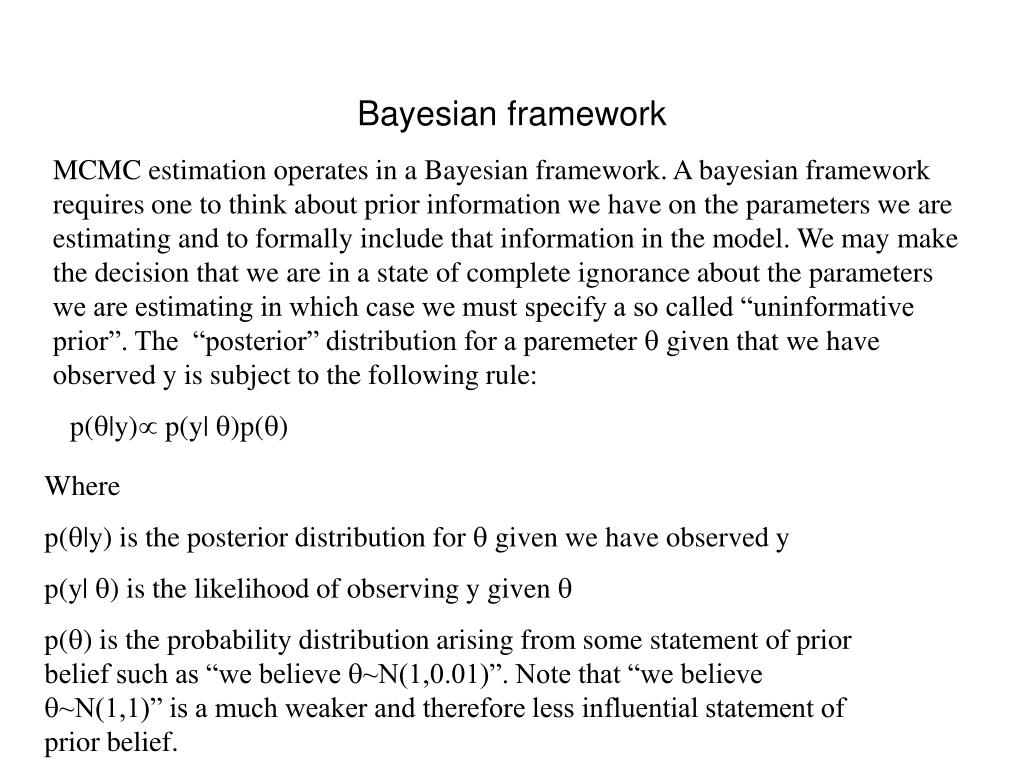 Bayesian framework MCMC estimation operates in a Bayesian framework. A bayesian framework requires one to think about prior information we have on the parameters we are estimating and to formally include that information in the model. We may make the decision that we are in a state of complete ignorance about the parameters we are estimating in which case we must specify a so called “uninformative prior”. The “posterior” distribution for a paremeter given that we have observed y is subject to the following rule: p(|y) p(y| )p() Where p(|y) is the posterior distribution for given we have observed y p(y| ) is the likelihood of observing y given p() is the probability distribution arising from some statement of prior belief such as “we believe ~N(1,0.01)”. Note that “we believe ~N(1,1)” is a much weaker and therefore less influential statement of prior belief.
