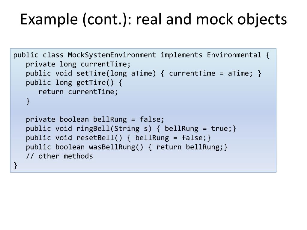 Example (cont.): real and mock objects public class MockSystemEnvironment implements Environmental { private long currentTime; public void setTime(long aTime) { currentTime = aTime; } public long getTime() { return currentTime; } private booleanbellRung = false; public void ringBell(String s) { bellRung = true;} public void resetBell() { bellRung = false;} public booleanwasBellRung() { return bellRung;} // other methods }