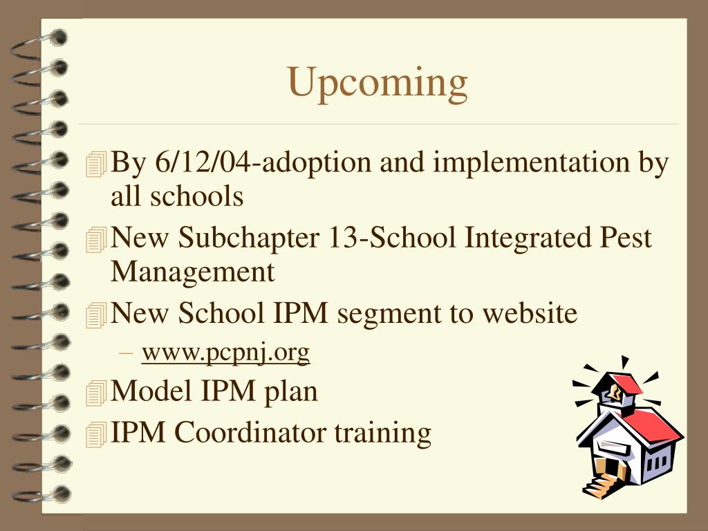 Upcoming • By 6/12/04-adoption and implementation by all schools • New Subchapter 13-School Integrated Pest Management • New School IPM segment to website • www.pcpnj.org • Model IPM plan • IPM Coordinator training
