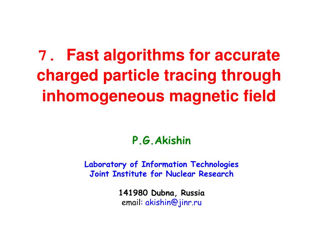 7. Fast algorithms for accurate charged particle tracing through inhomogeneous magnetic field P.G.Akishin Laboratory of Information Technologies Joint Institute for Nuclear Research 141980 Dubna, Russia email: akishin@jinr.ru