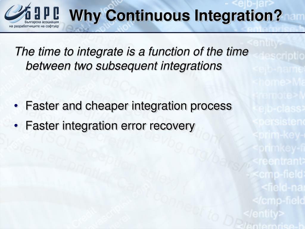 Why Continuous Integration? The time to integrate is a function of the time between two subsequentintegrations • Faster and cheaper integration process • Faster integration error recovery