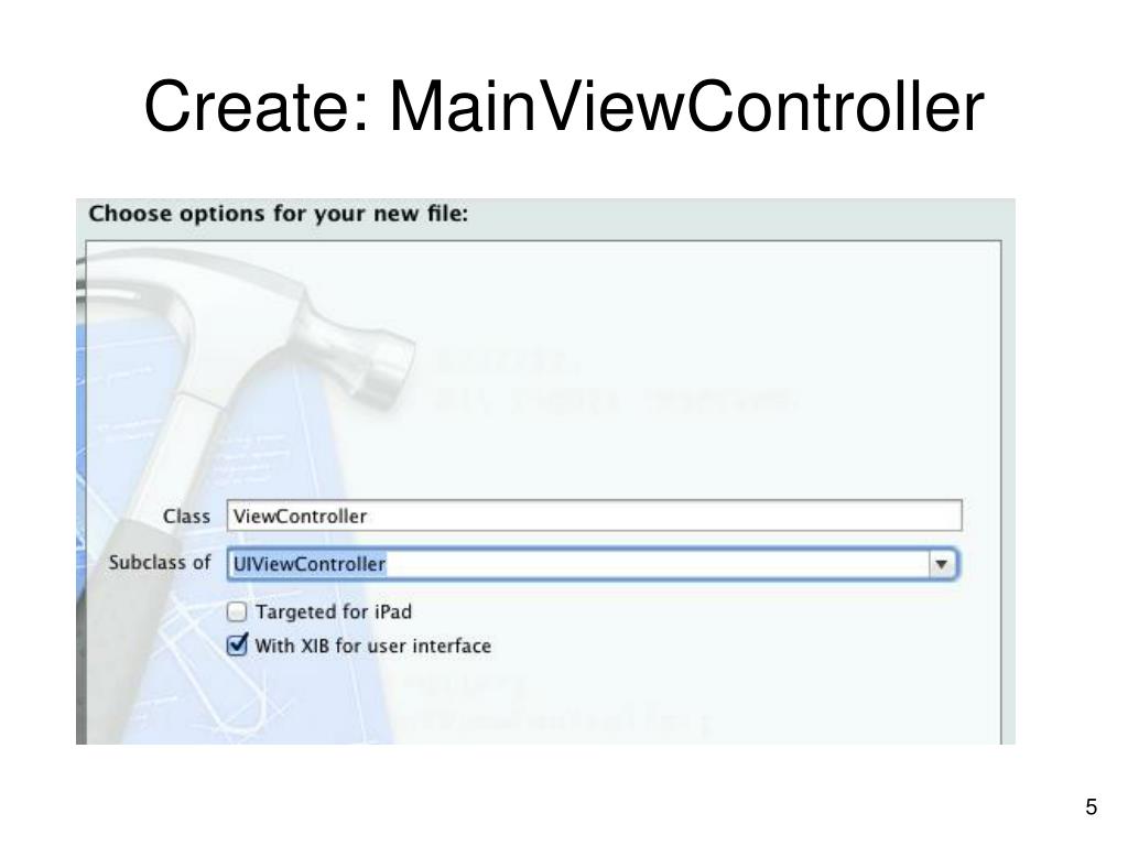 Add a new Class • Select the Objective-C class template, click Next • Name the class MainViewController. • Make sure that the class is a subclass of UIViewController and also create a XIB file for the controller’s view as shown: